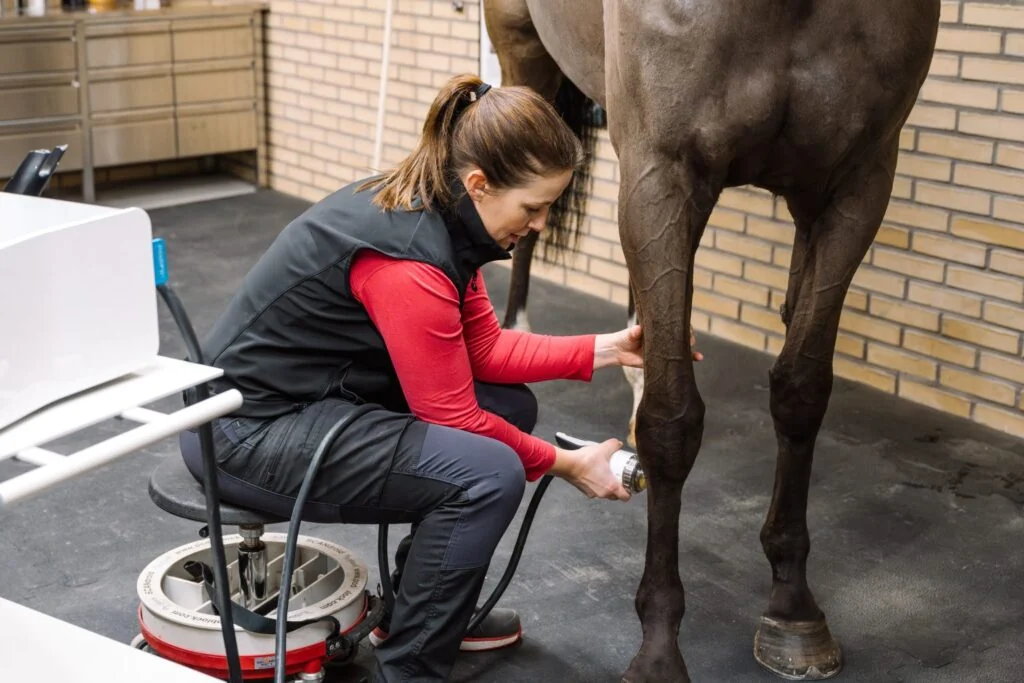 Detta är en behandlingsmetod som på svenska även kallas ”stötvågsbehandling”. Det finns två olika varianter av stötvåg, radiell och fokuserad. Vi använder den fokuserade där man kan bestämma vilket djup man ska välja beroende på skadans lokalisation. Metoden kan användas ensamt eller som komplement för behandling av olika typer av ffa ligament- och senskador. Även leder, muskler och svårläkta sår kan behandlas. Behandlingen har en antiinflammatorisk och smärtstillande effekt som på så sätt påskyndar och underlättar läkningsprocessen. Stötvågsbehandling innebär 10 dagars startkarens och får enbart utföras under veterinärs ansvar.